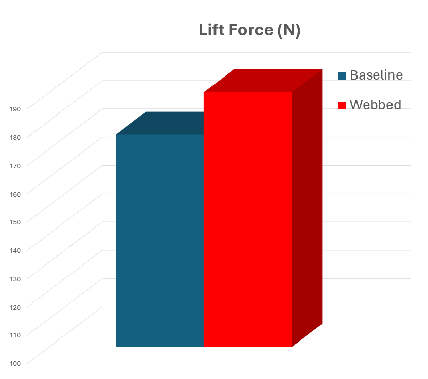 For an 8 cm increase in the webbing and a flight speed of 25 m/s, the total lift force increased from 175 N to 190 N. This equates to an 8.6% increase in lift force.