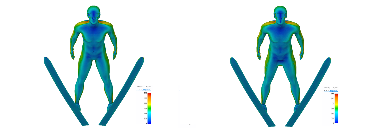 When a ski jumper flies after take-off, they spread the skis to create a V-shape and lean forward into an optimal aerodynamic position. However, there’s still a large open area between the skier’s legs – compared to someone wearing a wingsuit with webbing between the legs. Increasing the surface area is an attempt to increase lift force and achieve a longer flight over a greater distance.