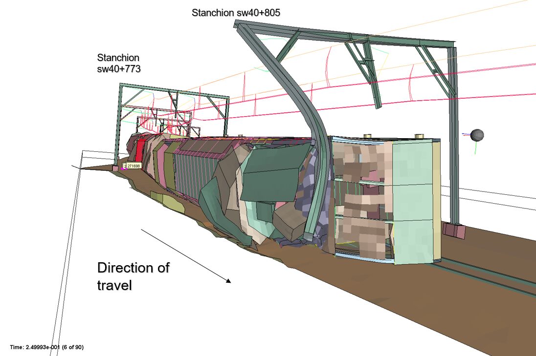 The leading car slid on the ramp and impacted with the rock cutting wall. The reaction force pushed it up. The leading car turned itself upright and also went up along the ramp a few metres before dropping off (Time 0.85s). The main damage to the front top of leading car was caused by impact with the rock cutting wall, although the stanchion and its footing also caused significant damage.
